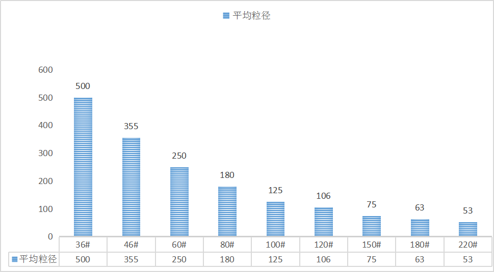 指的是通過篩網(wǎng)的砂粒的平均直徑。如下圖粒徑表所示:#60粒度的磨粒,平均粒徑大約是250um。不同種類篩子網(wǎng)格線直徑有所差異,相同目數(shù)對應(yīng)的粒徑略有不同。各國和各行業(yè)訂立的標(biāo)準(zhǔn)也有所差異。像是日本和美國通常以目表示,歐規(guī)通常以粒徑表示。